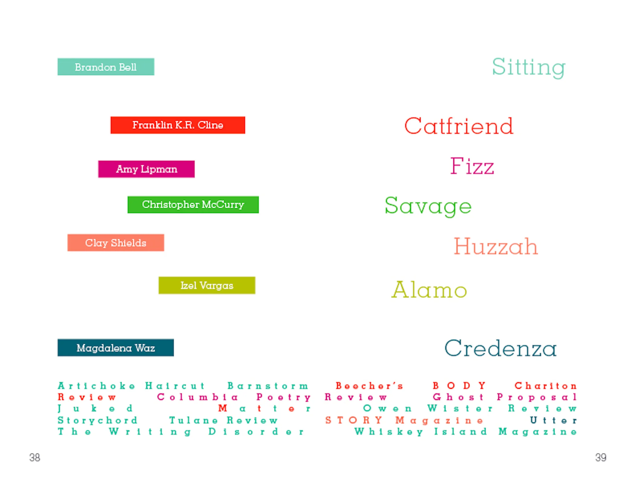 Fiction and poetry by: Brandon Bell, Franklin K.R. Cline, Amy Lipman, Christopher McCurry, Clay Shields, Magdalena Waz